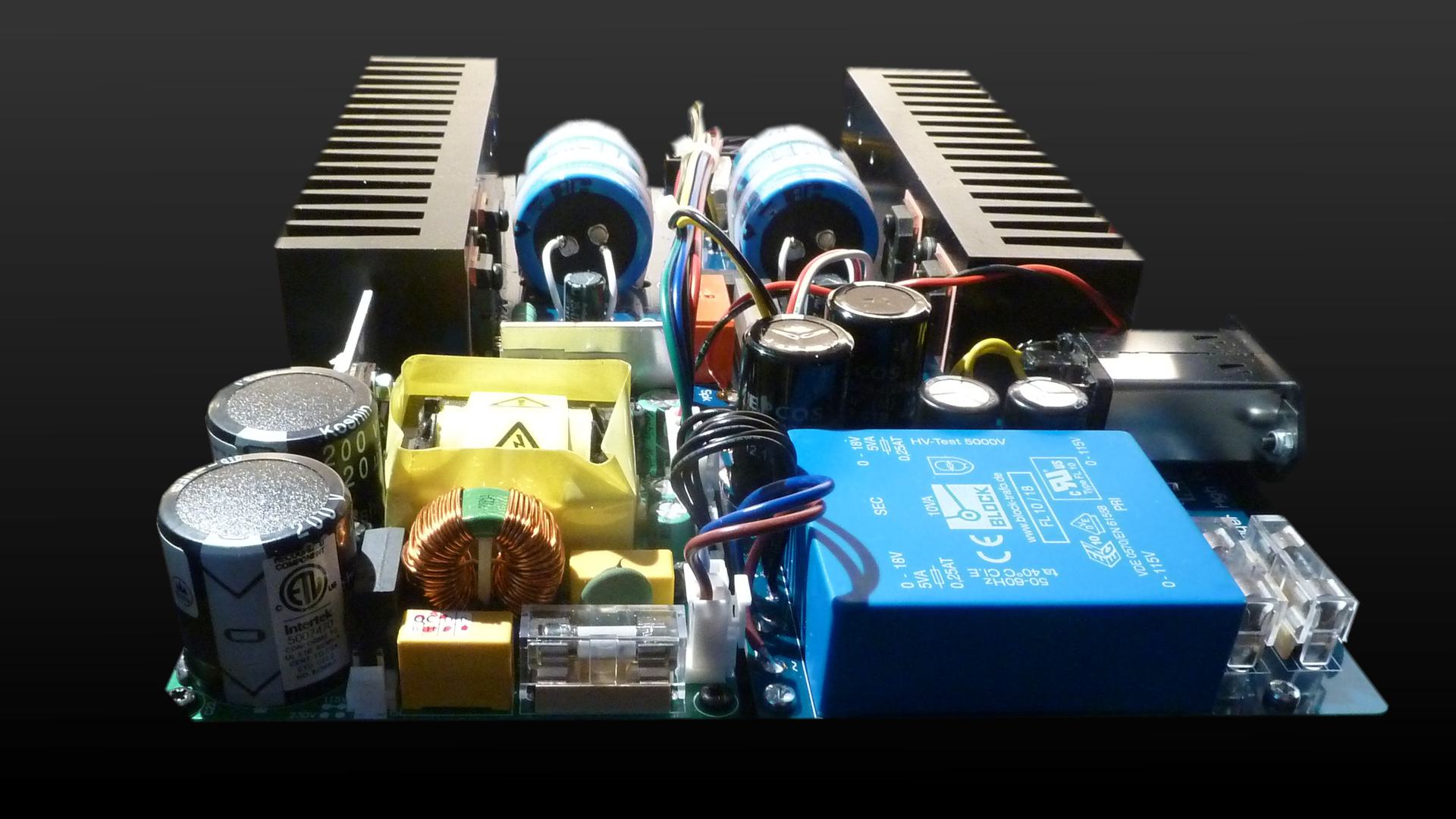 Our Kratos mono block amplifier differs in many respects compared to normal transistor power amps. When looking to available hybrid designs were tubes will drive the power output stage, soundwise Kratos will have lots of similarities. Like them Kratos has an airy and spacious sound but with the control and grip of a transistor amplifier. A disadvantage of these hybrids however is the problem of aging of the triodes. To avoid this problem for our Kratos a front end has been made with high voltage fet transistors. As a result, the measurable properties are completely identical compared to triodes, but having the advantages that no aging occurs. A similarity is the high operating voltage to get these circuits working. The result is a high degree of linearity. From this point on, the circuit drives a class A/B mosfet output stage. Only a small amount of feedback is needed to get the correct gain, but at the same time it also improves the damping factor. While a dedicated circuit for the high voltage is made, the output stage is powered from a heavy 400 Watts power supply.